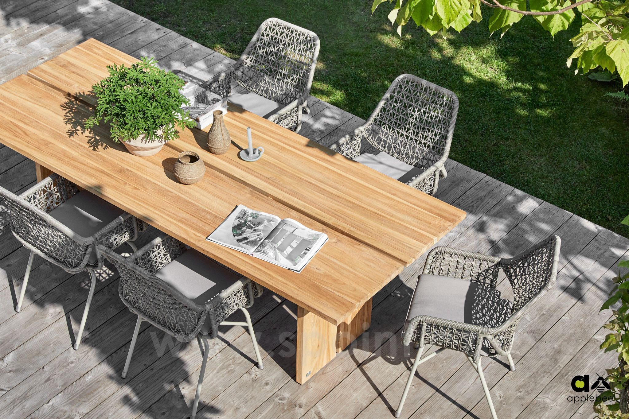 Venkovní jídelní stoly z teakového dřeva Joie de Vivre od značky Apple Bee.