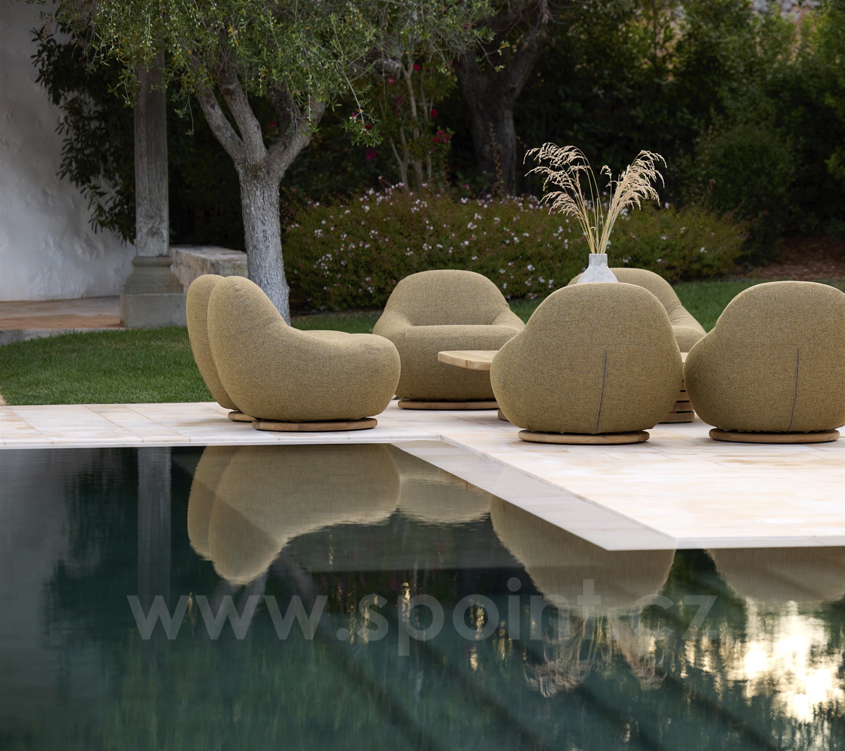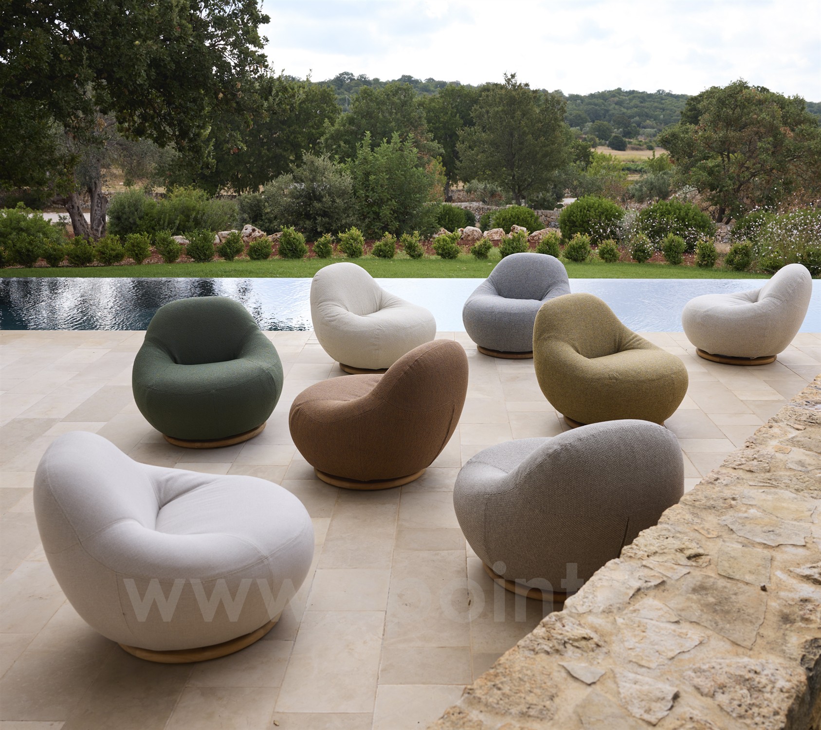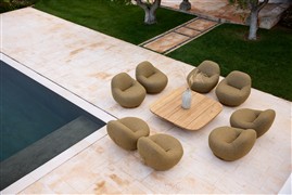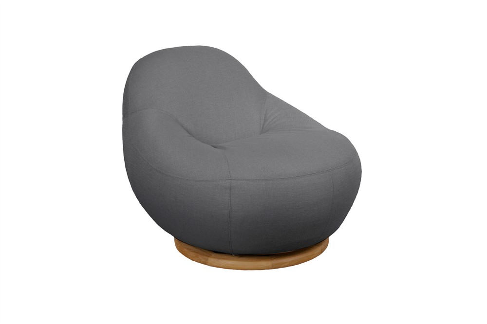 Křeslo je plně čalouněné s otočnou základnou z teakového dřeva.