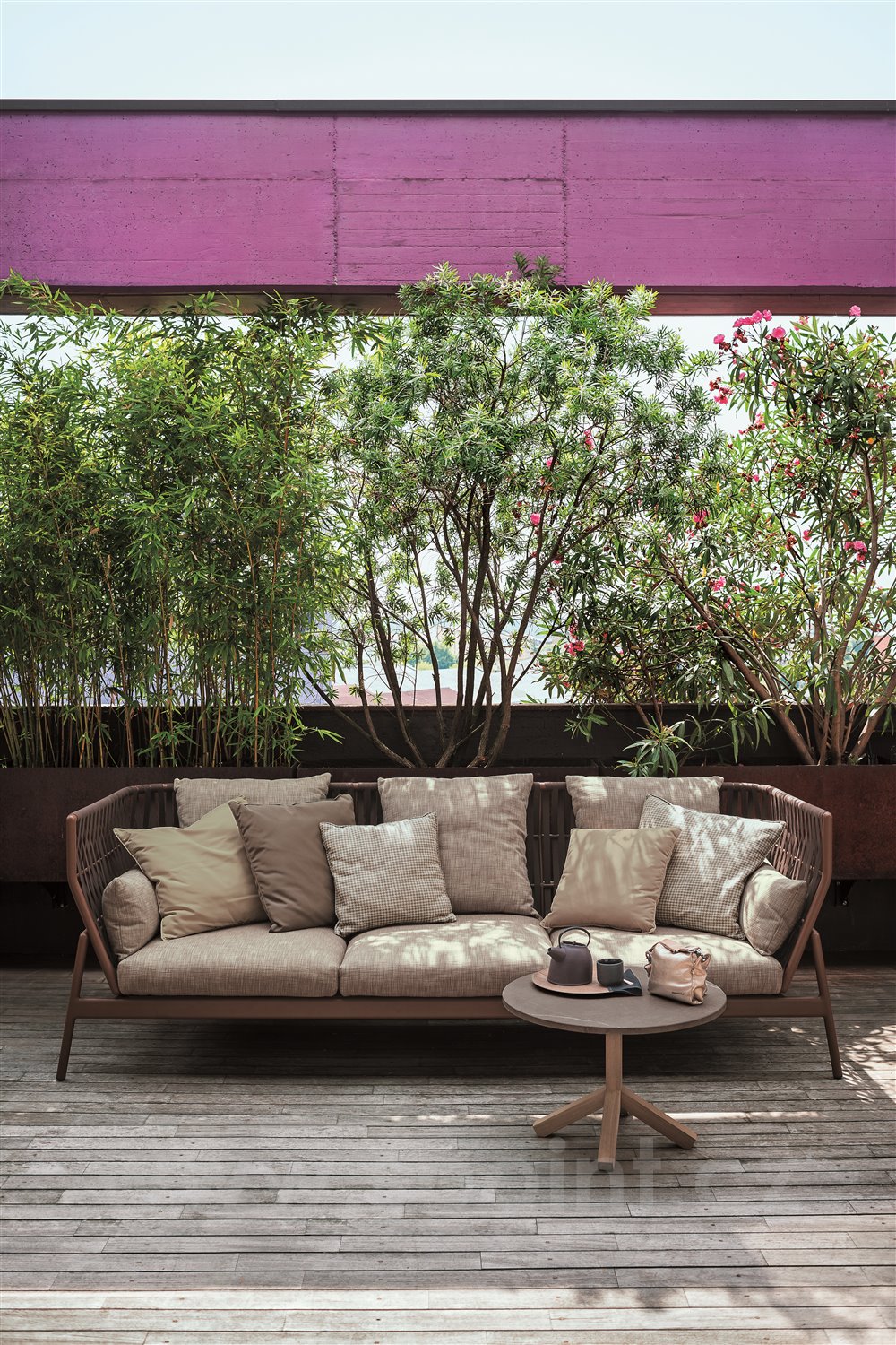 Dvoumístné sofa Roda Piper Belt, lakování rust (rezavá), výplet modré pásy. Design Rodolfo Dordoni.