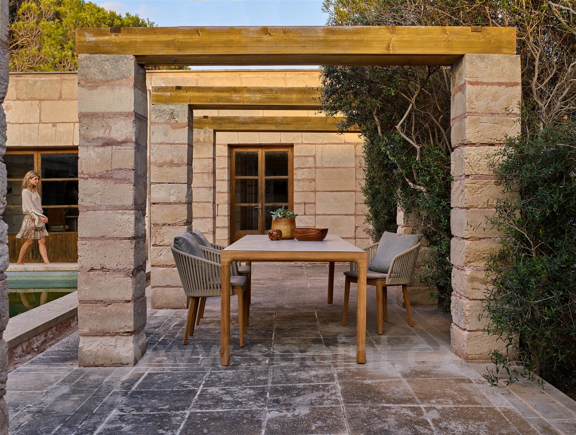 Elegantní teakový jídelní venkovní stůl Illum značky Tribu, rám je z teakového dřeva, deska z keramiky (barva LINEN). Rozměr: 267x100x76 cm.