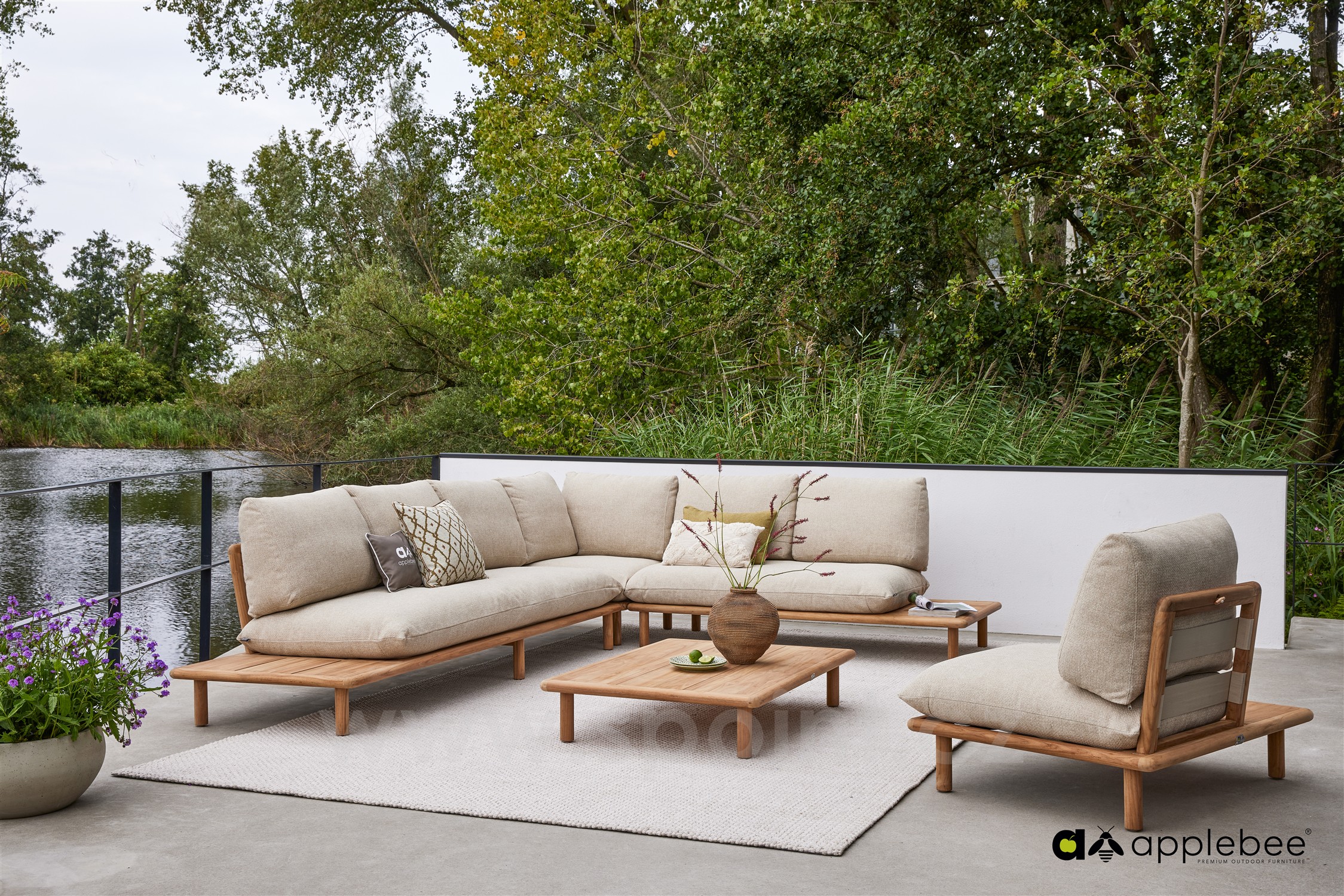 Rohový díl Sling, Apple Bee, 85x85x67 cm, rám teak natural, pásový výplet Ecru, sedáky venkovní látka Cotton Flower