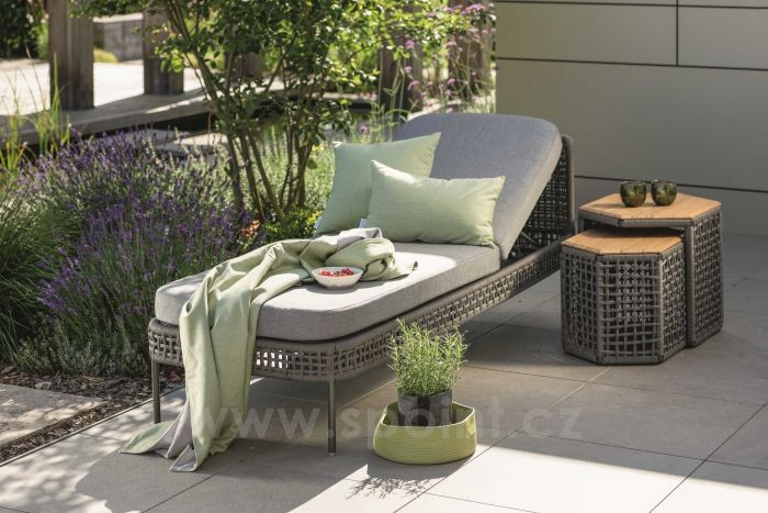 Relaxační nábytek včetně denní venkovní postele z lankového výpletu.