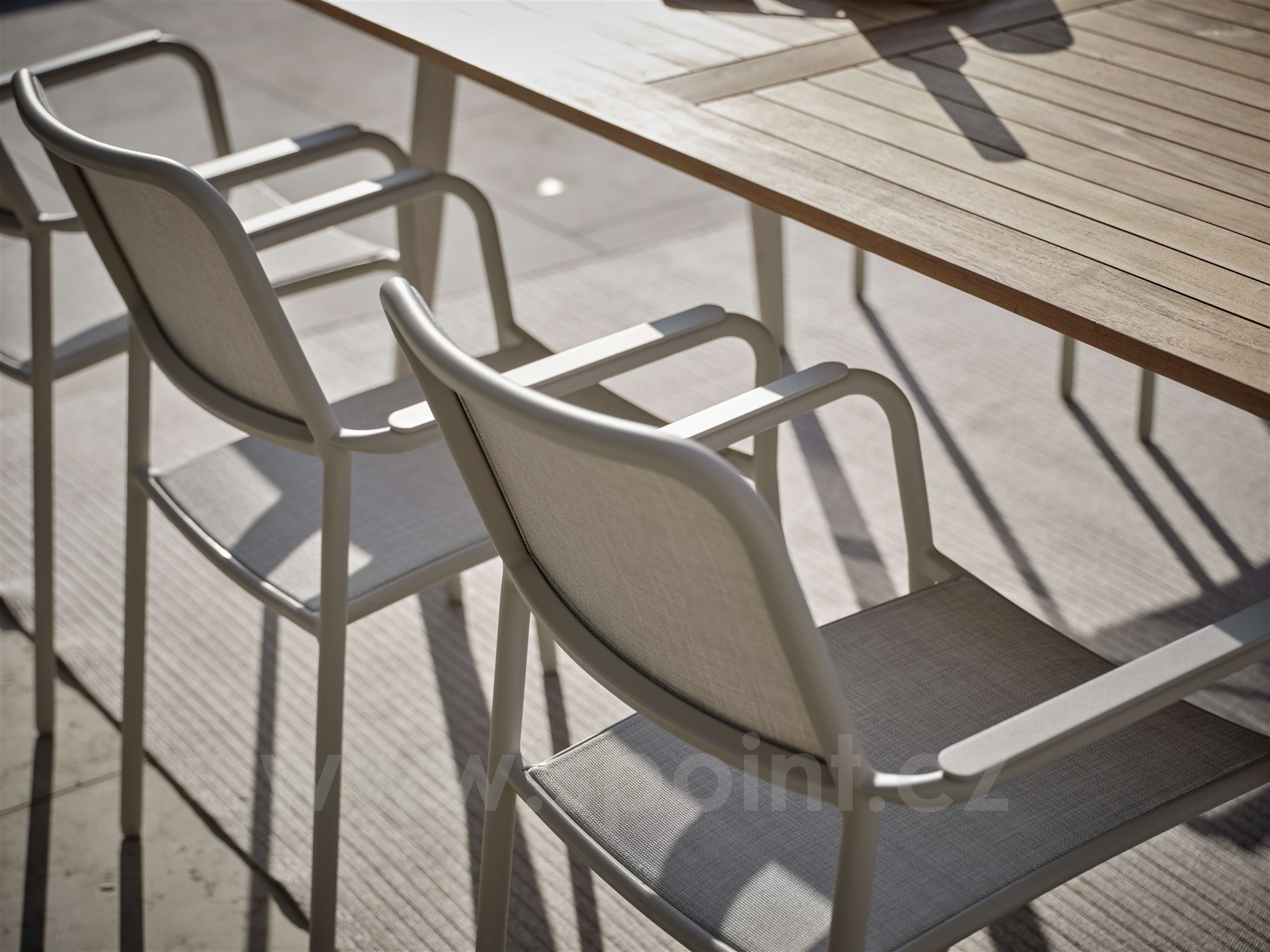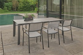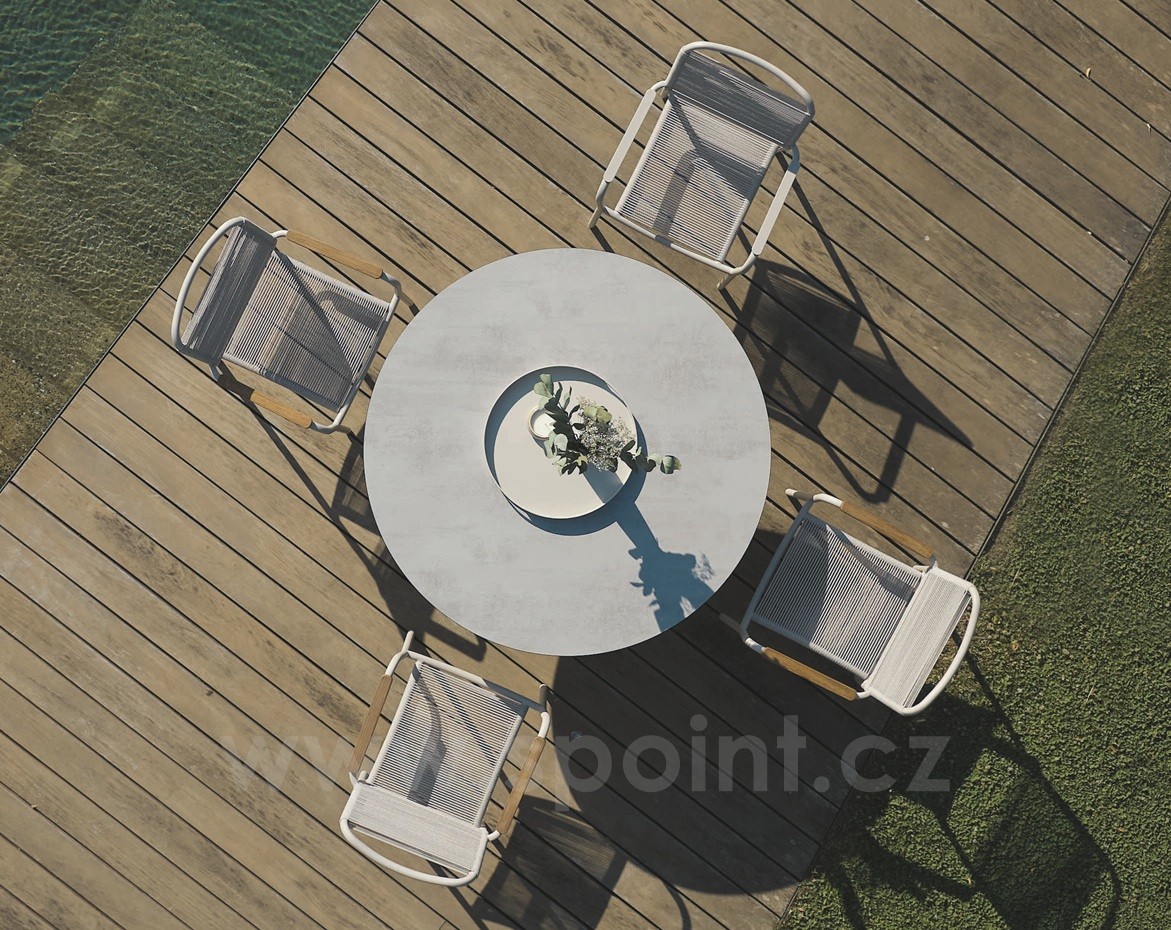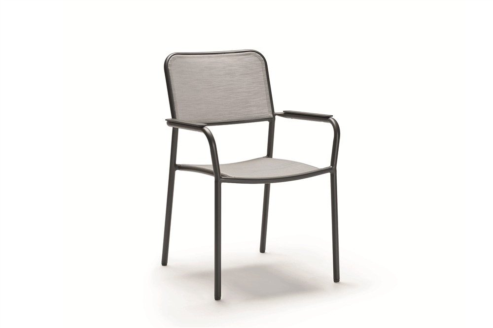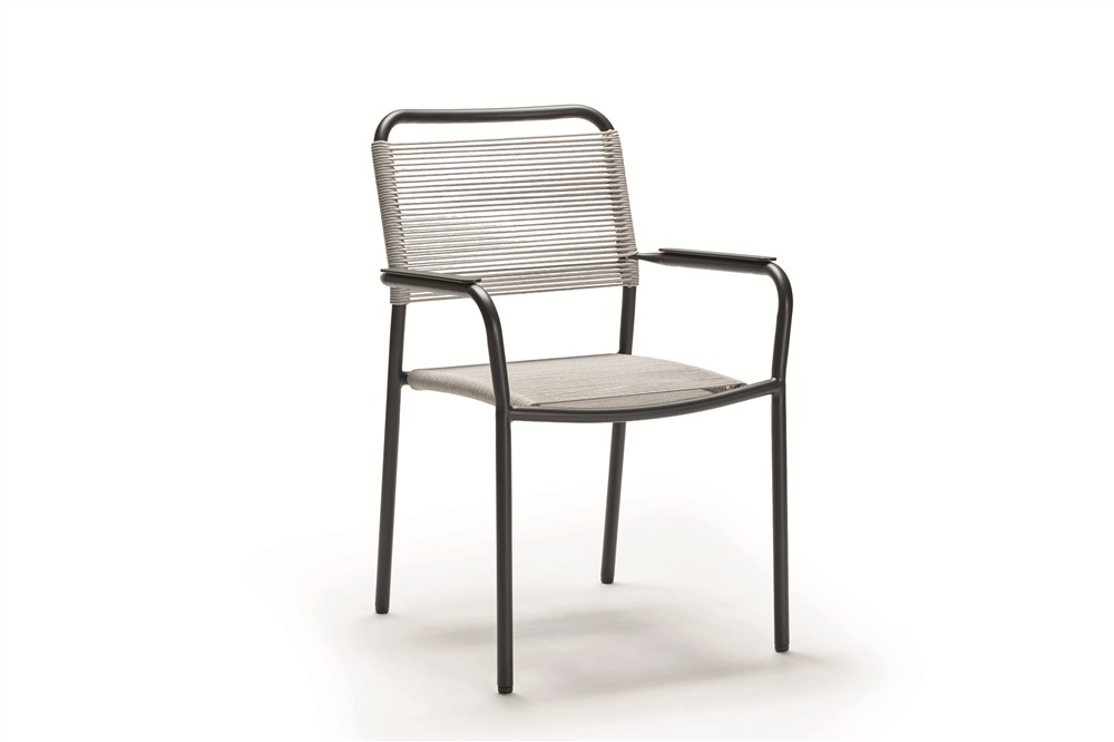 Venkovní hliníková jídelní stohovatelná křesla v různých barvách. Výplet je z pohodlného a pružného textilenu nebo atraktivních venkovních lanek. Křeslům lze přidat teakové područky za příplatek.