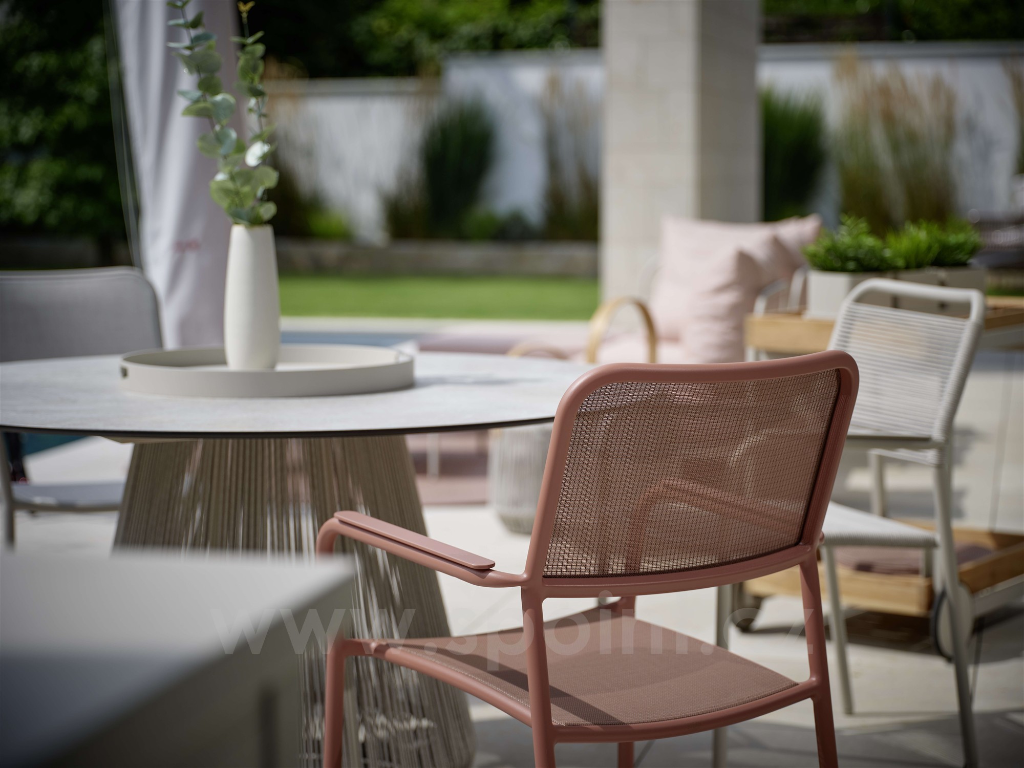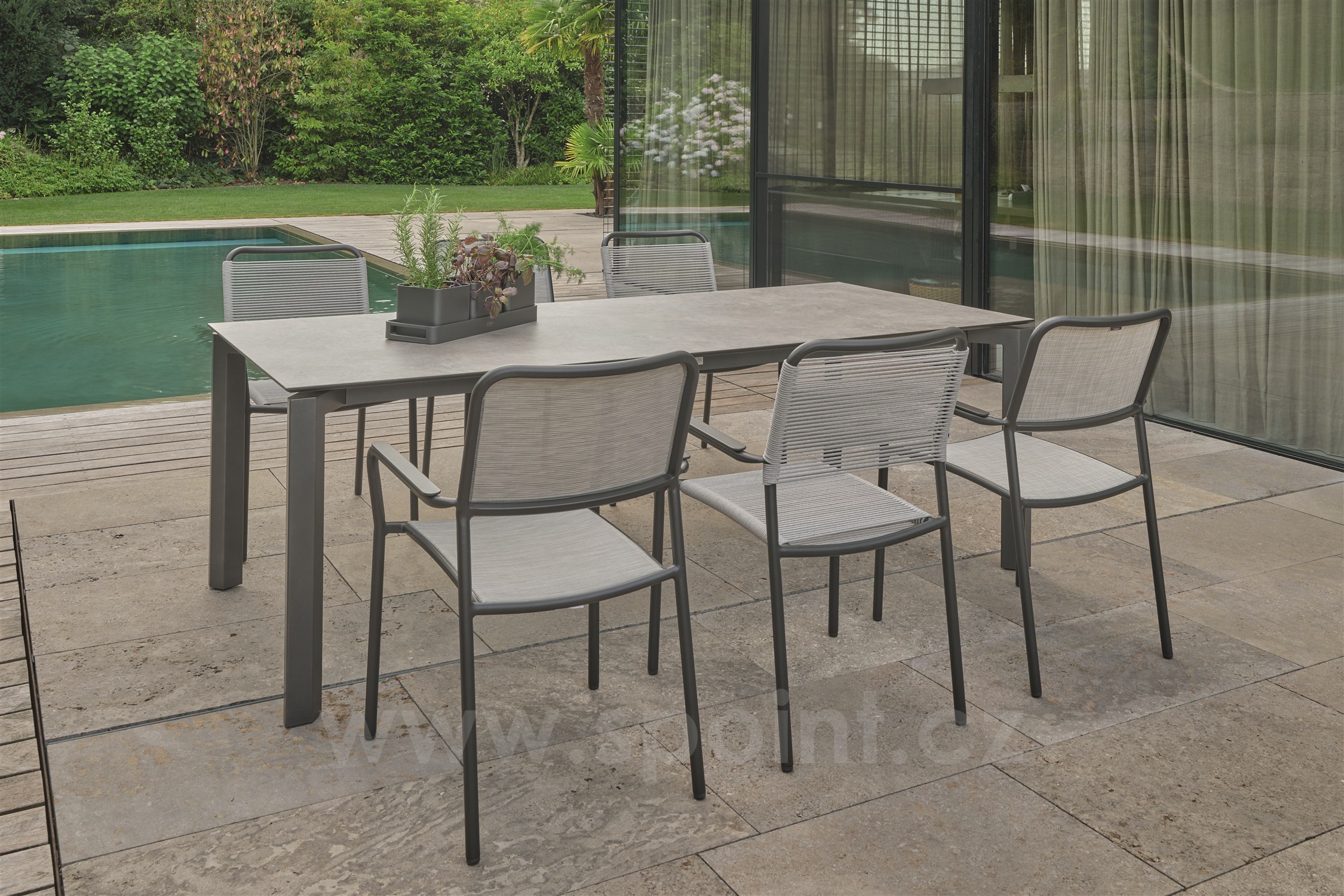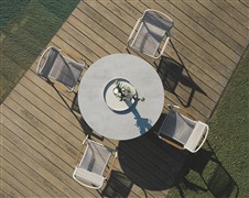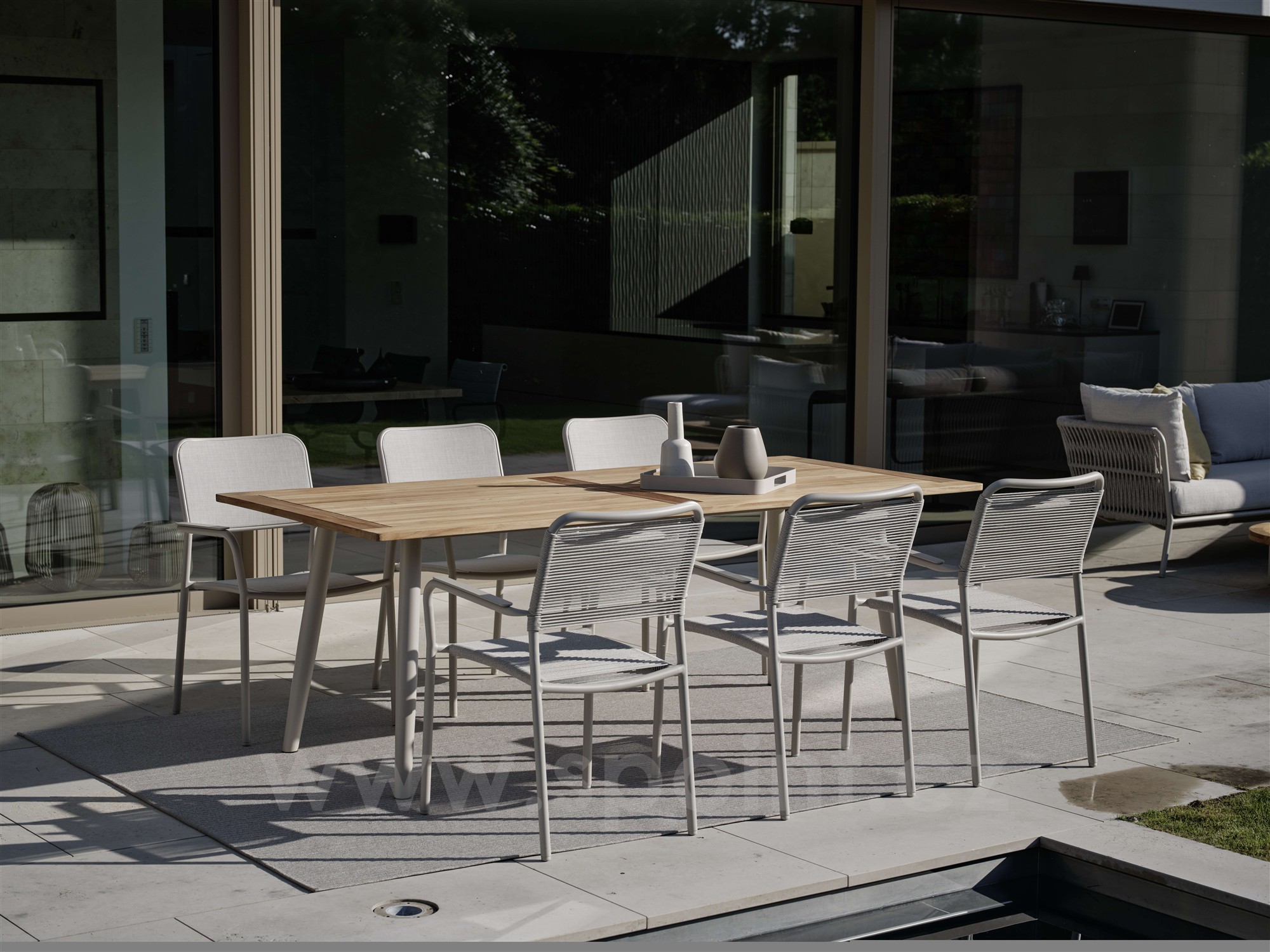 Venkovní hliníková jídelní stohovatelná křesla v různých barvách. Výplet je z pohodlného a pružného textilenu nebo atraktivních venkovních lanek. Křeslům lze přidat teakové područky za příplatek.