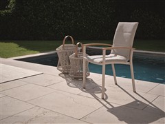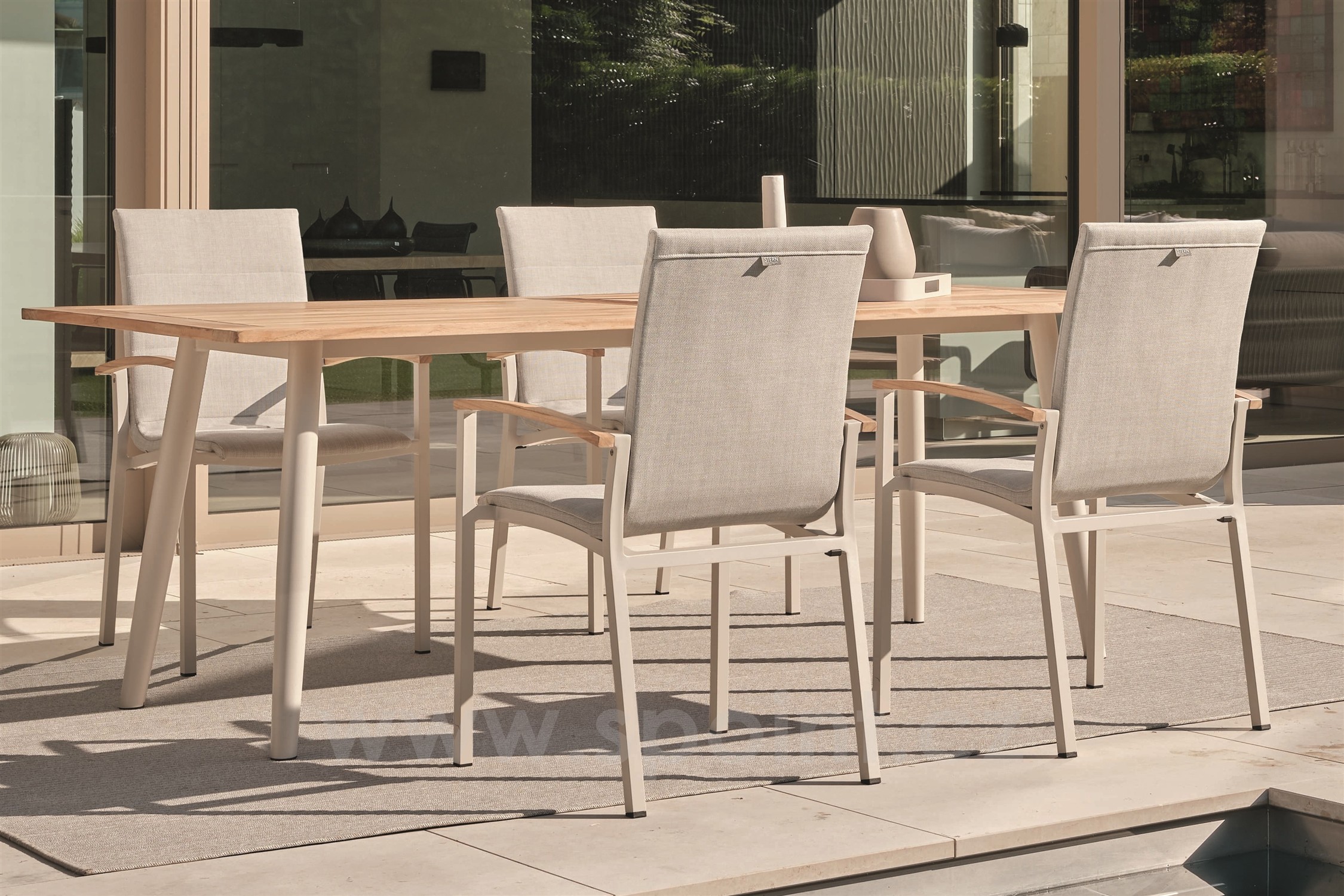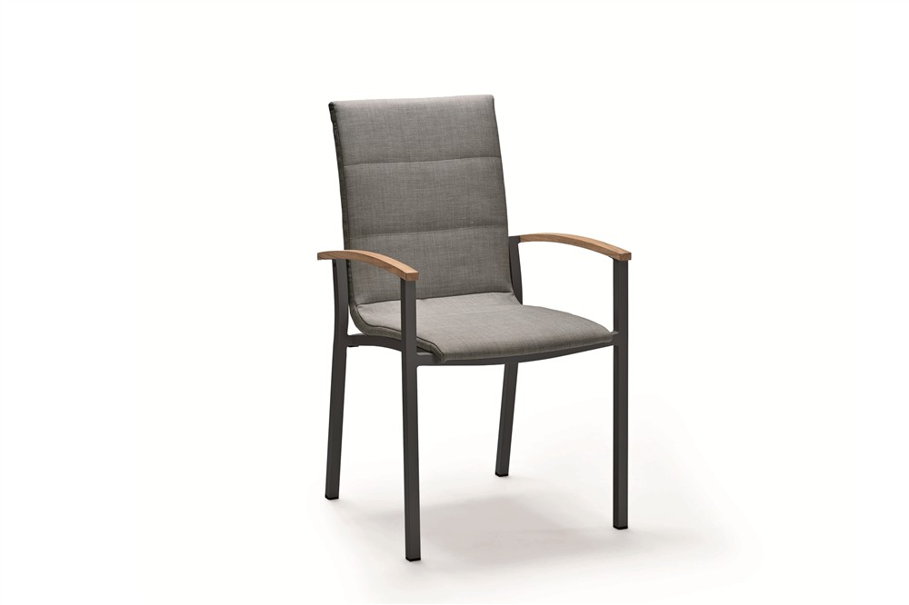 Pevná polstrovaná stohovatelná zahradní křesla s vyšší opěrkou a teakovými područkami.