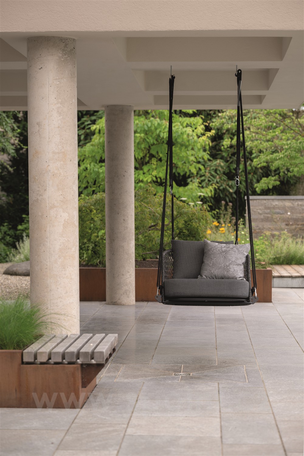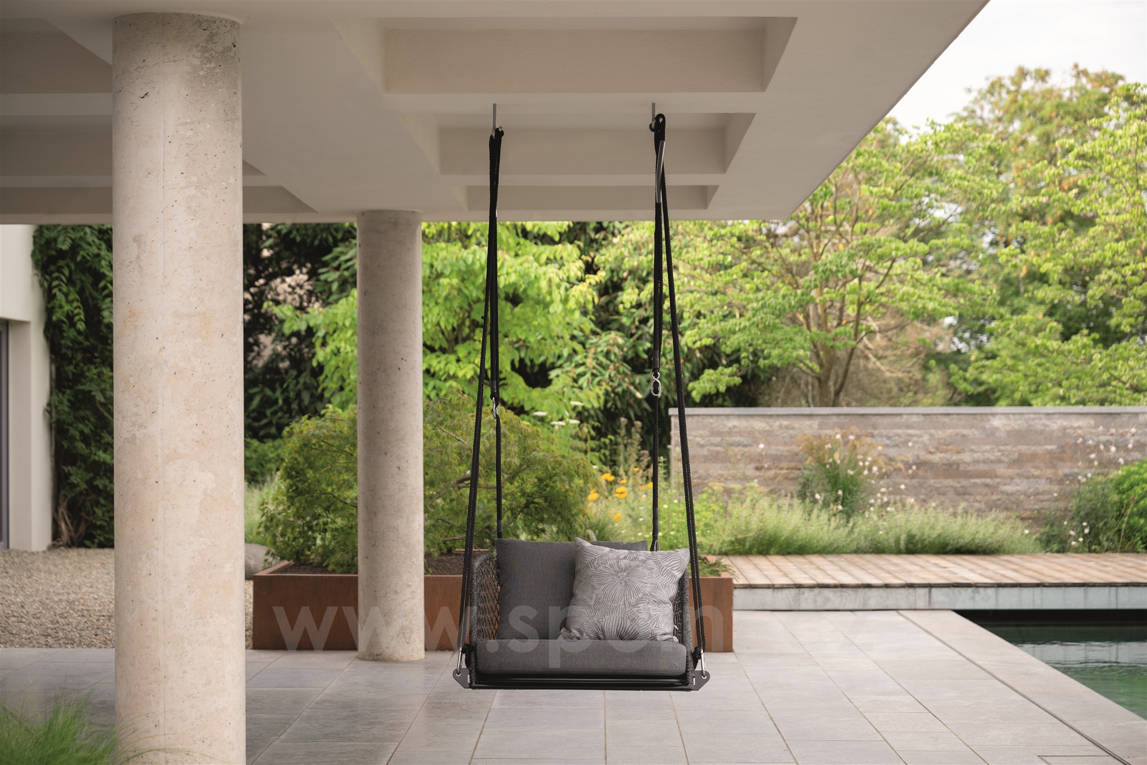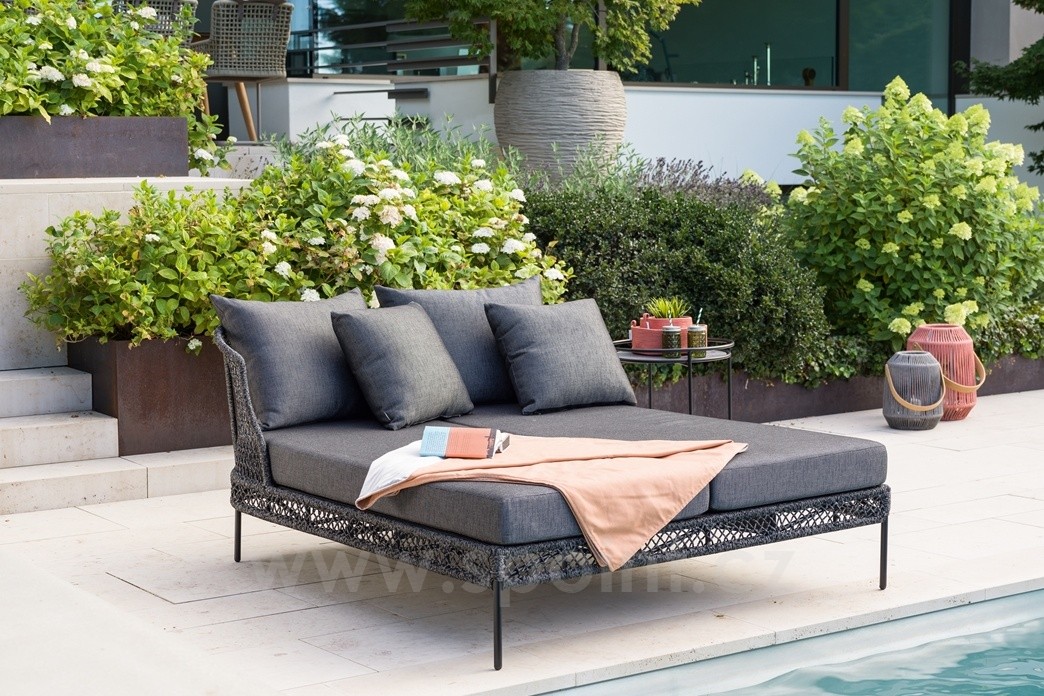 Kolekce venkovních postelí a závěsných houpacích křesel s lankovým výpletem a venkovními sedáky.