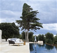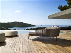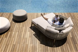 Venkovní postele Mood značky Tribu. Rám je z teakového dřeva v kombinaci s lankovým výpletem.