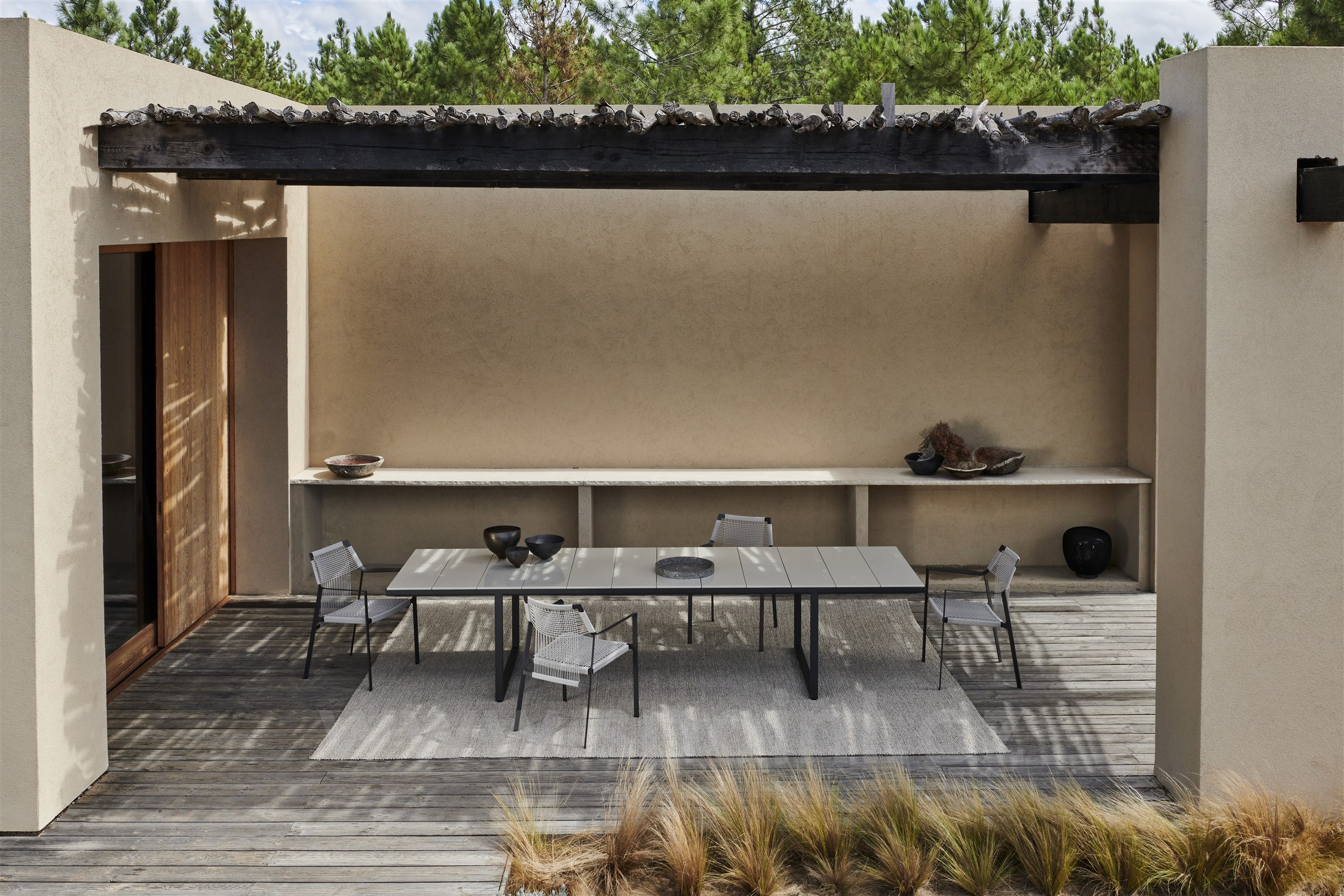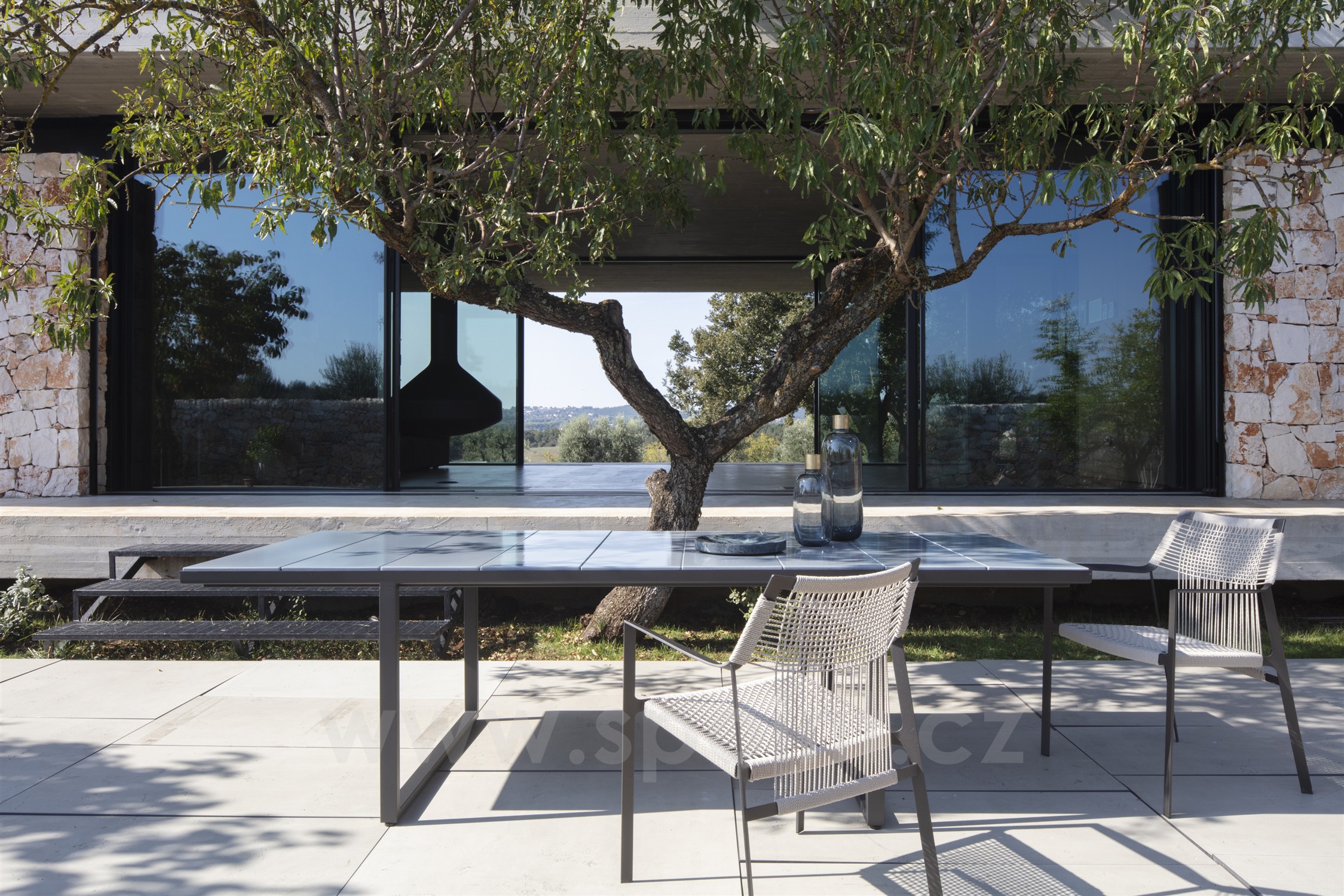 Venkovní jídelní stůl Nox značky Tribu s deskou z glazovaného lávového kamene.