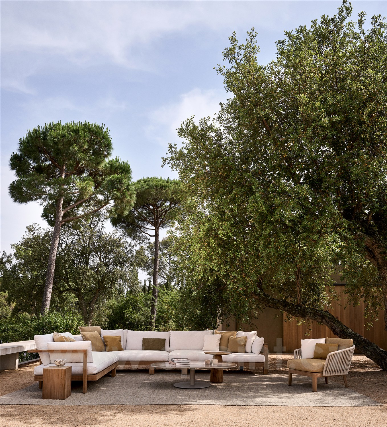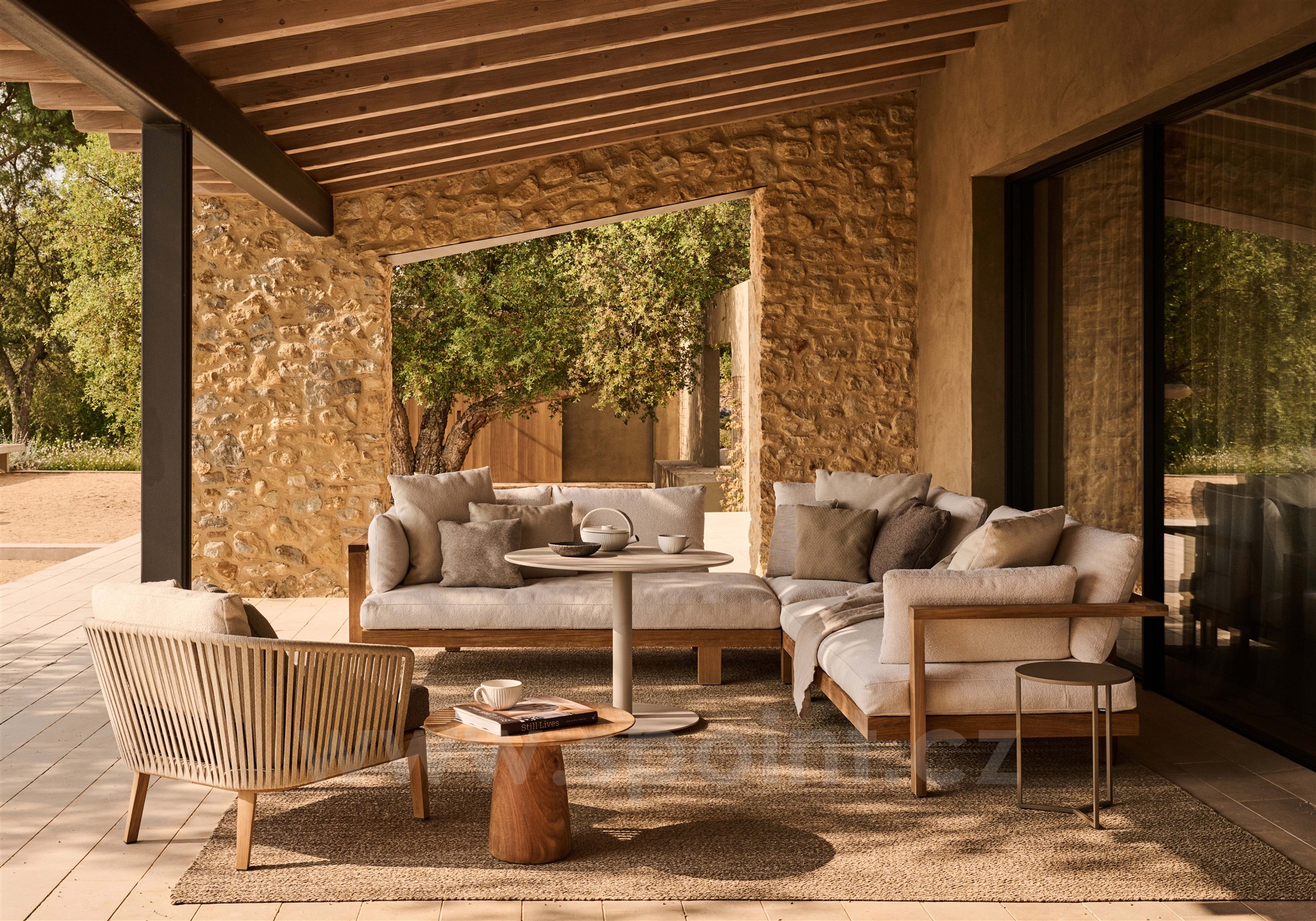 Pohodlná oblíbená luxusní venkovní sedací sestava z teaku značky Tribu.