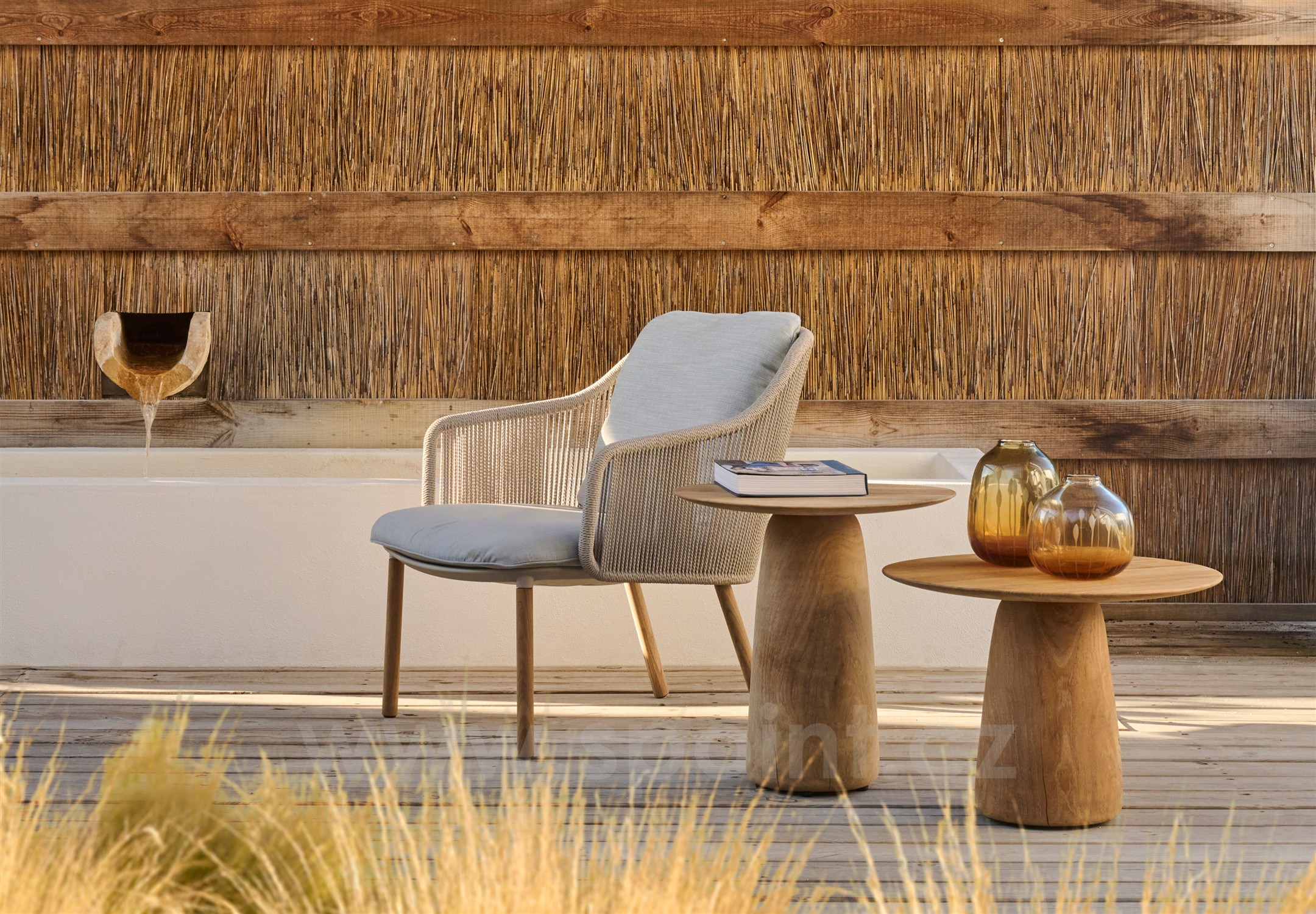Subtilní a přitom pohodlné nízké venkovní křeslo s lankovým výpletem.