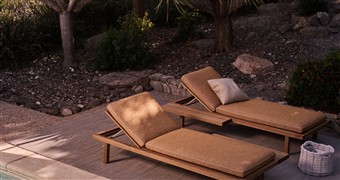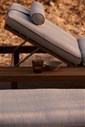 Venkovní polohovací lehátko s odkládacím stolkem Vis a Vis značky Tribu z teakového dřeva.