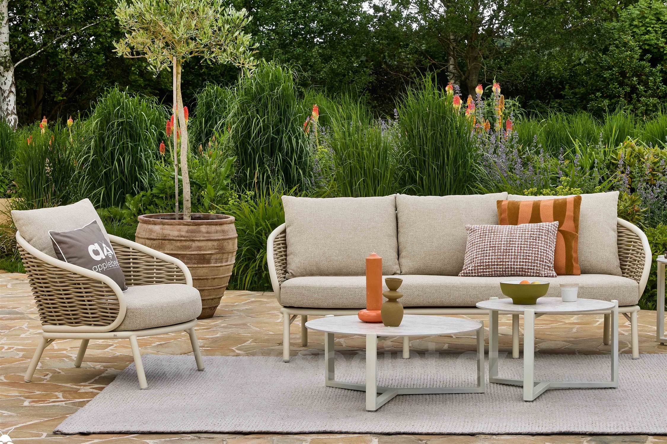 Elegantní 3- místná pohovka Pine Key od Apple Bee s rámem z lakovaného hliníku (barva dle vzorníku) a umělého ratanu, sedáky jsou z venkovní látky (barva dle vzorníku), mají rychleschnoucí výplně a mohou zůstat na dešťi.