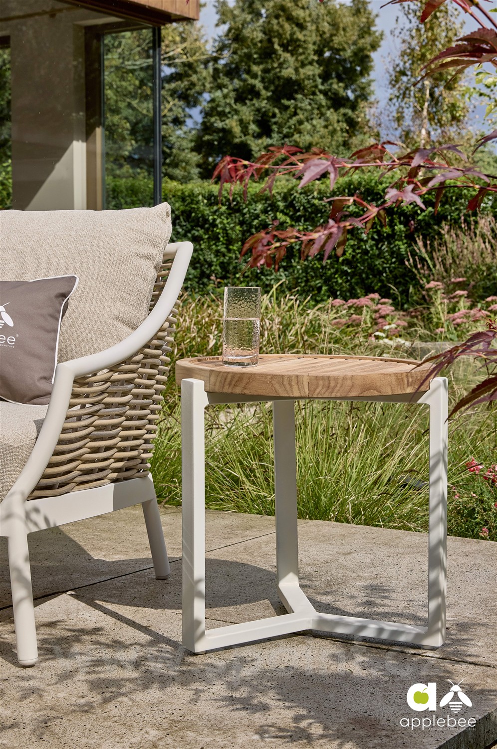 Konferenční stolek Monaco, Apple Bee, kulatý 75x34 cm, rám hliník Oyster (krémová), deska teak