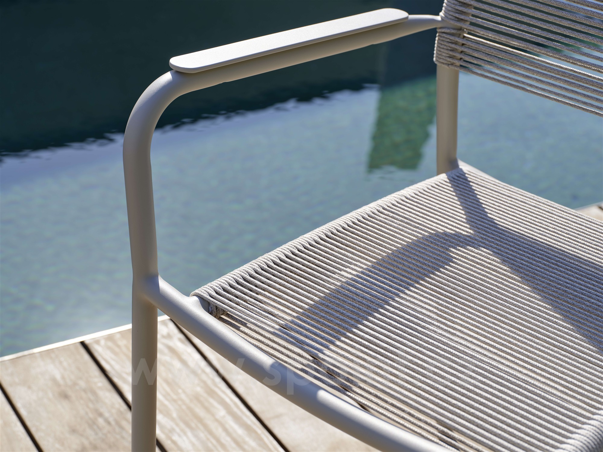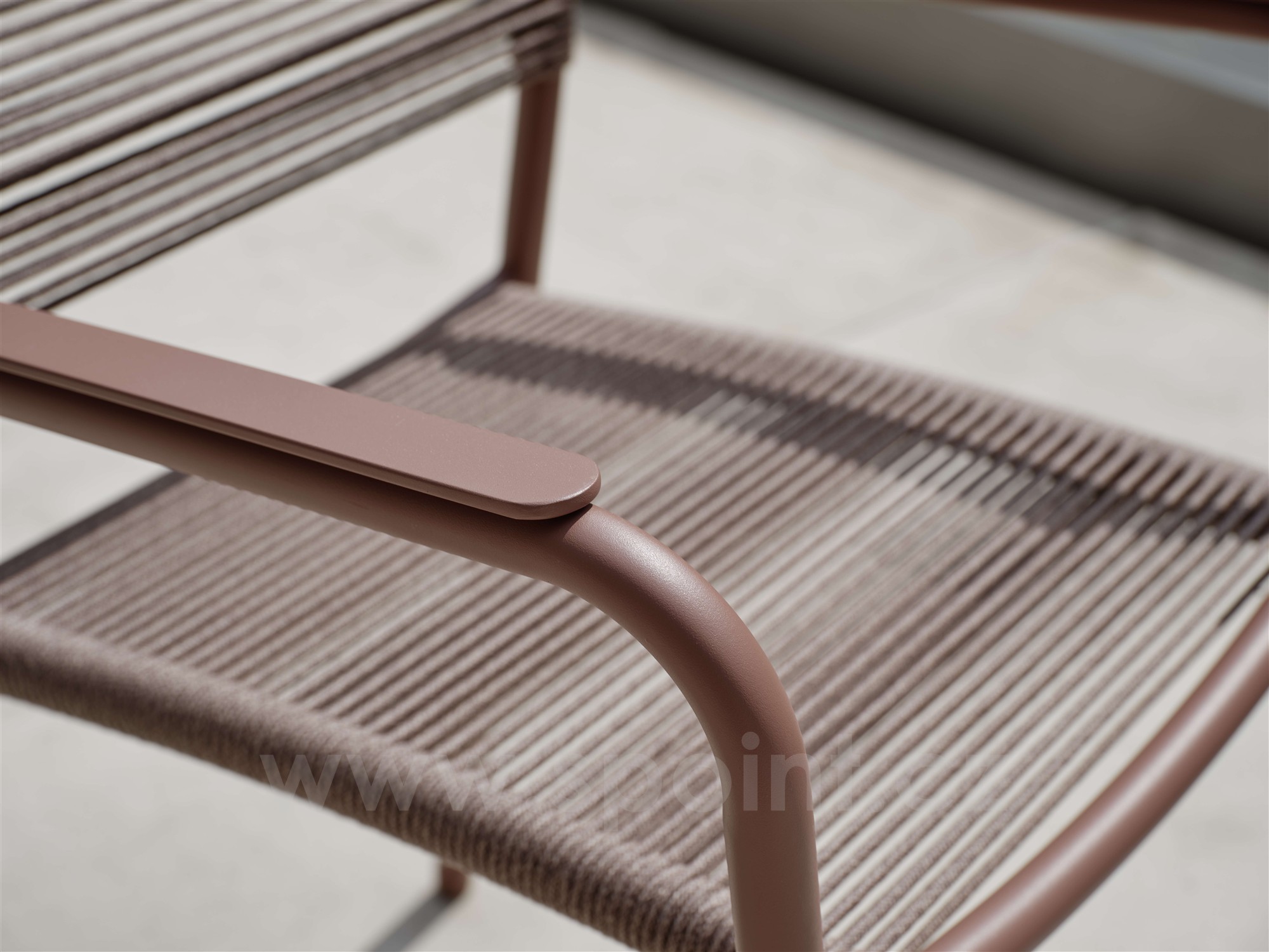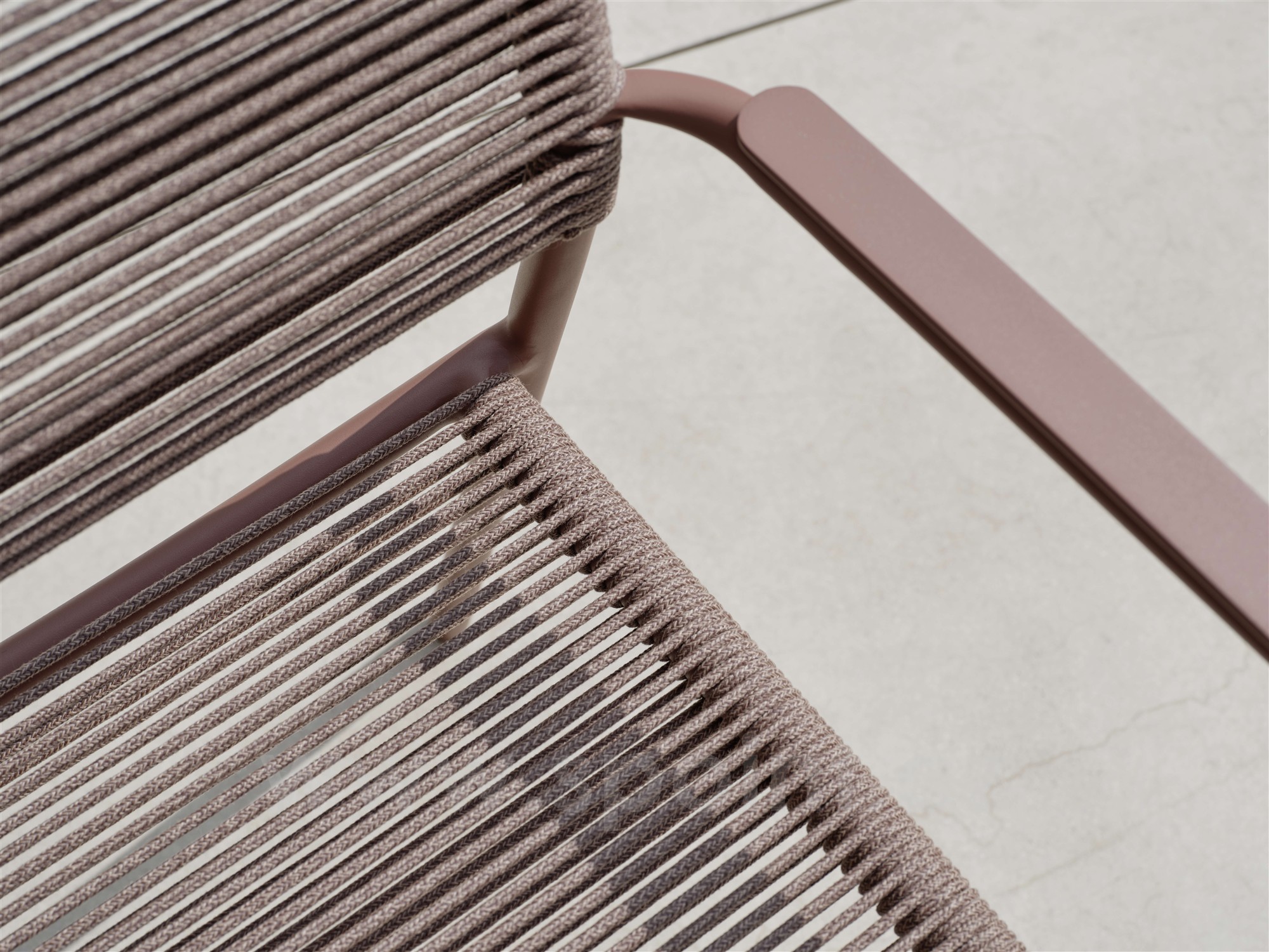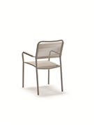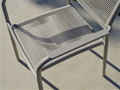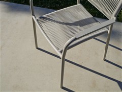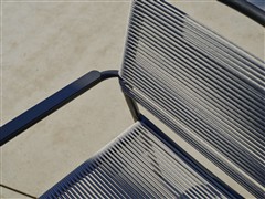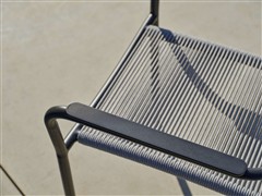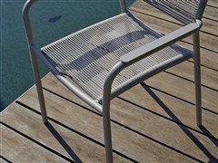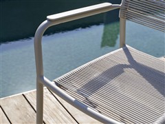 Jídelní křeslo má hliníkový rám a výplet z lanek.